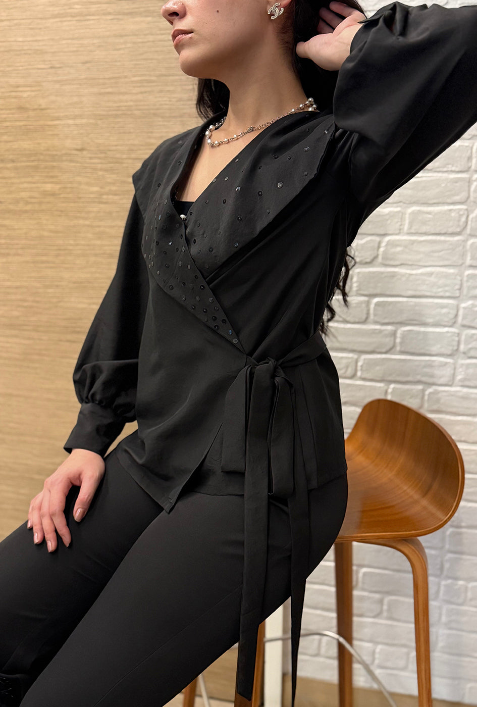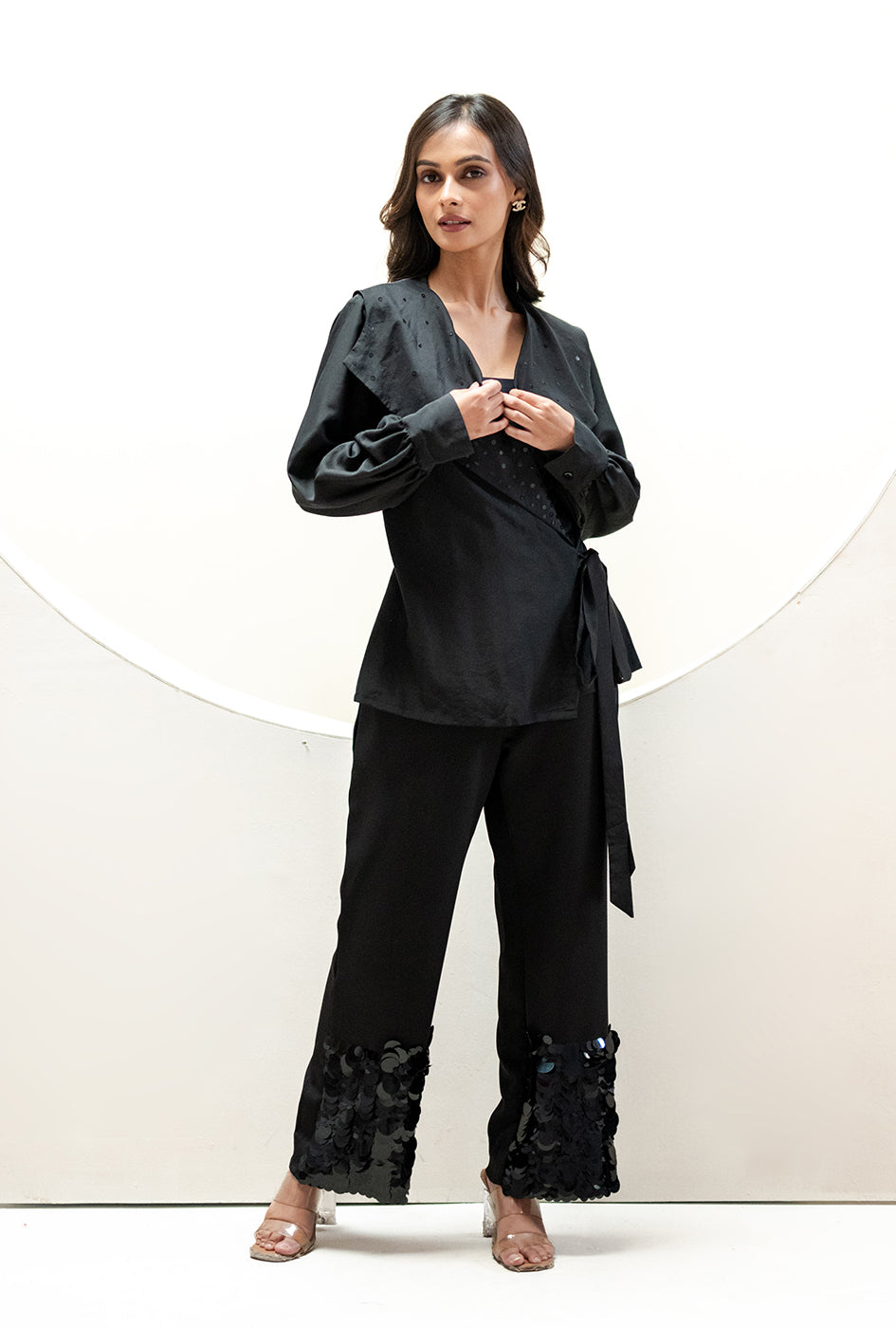 Paired here with black crepe bottoms finished with sequin embellishments. Length 37" for S-M and 38" for L&XL