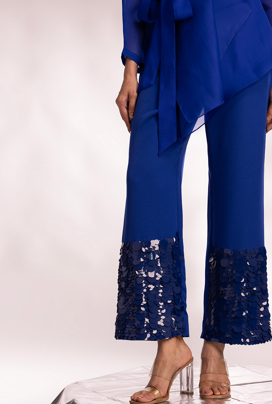 Paired here with matching crepe bottoms finished with sequin embellishments.