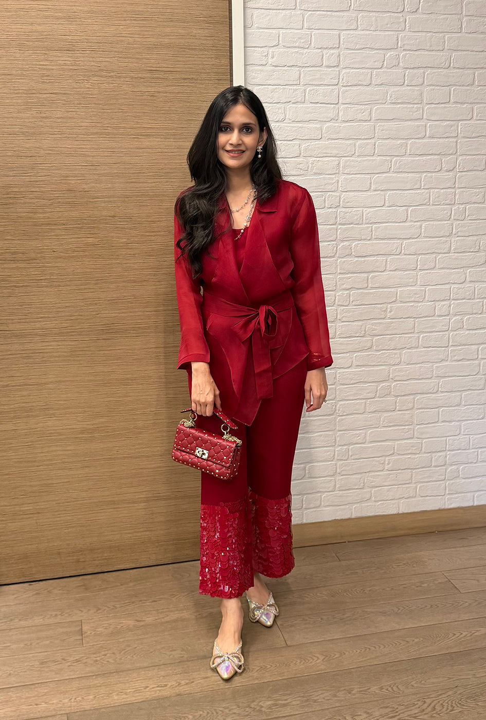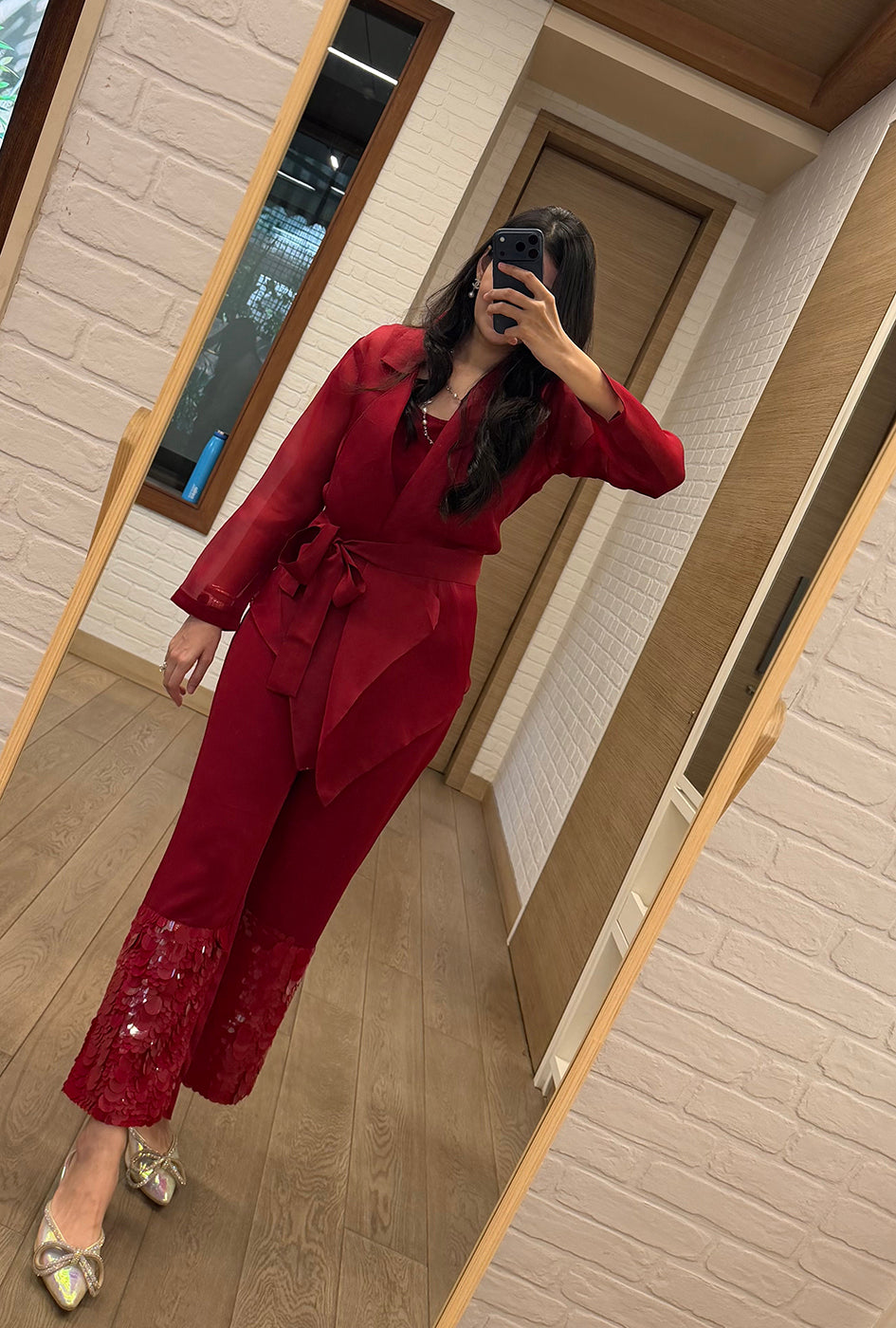 Composition: Organza Jacket & Crepe Bottoms (with mild spandex)