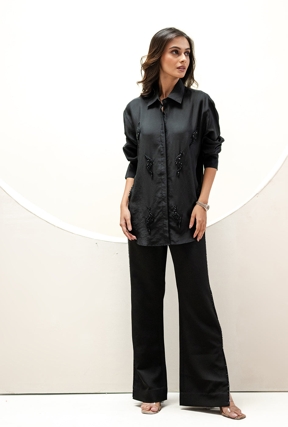 Our Pearl Oasis Shirt is adorned with pearls which makes it super delicate yet chic. It exudes an edgy charm suitable for any formal occasion, seamlessly transitioning from day to night